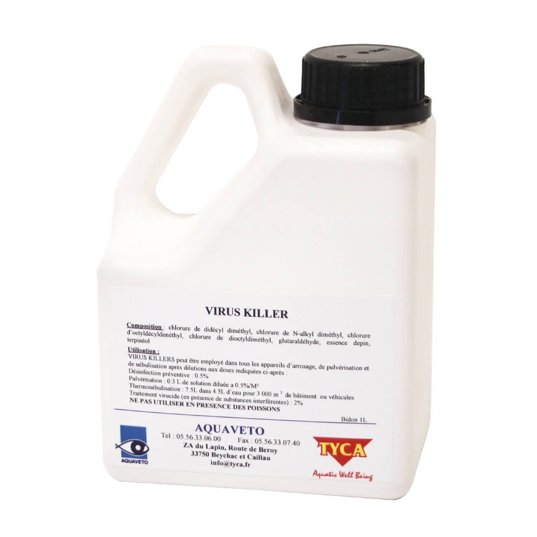 Plus d'info...• VIRUS KILLER est un désinfectant VIRUCIDE-BACTERICIDE-FONGICIDE à base de 4 ammoniums quaternaires associés à un aldéhyde qui renforce leur activité en présence de matières organiques.