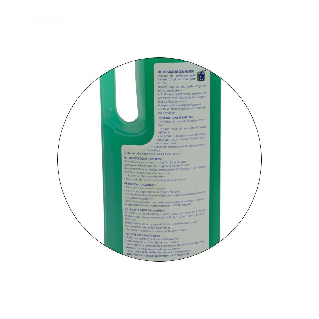 • Dosage pour sol peu souillé : 2,5g/L (0,25%) soit 20mL pour 8L d’eau.