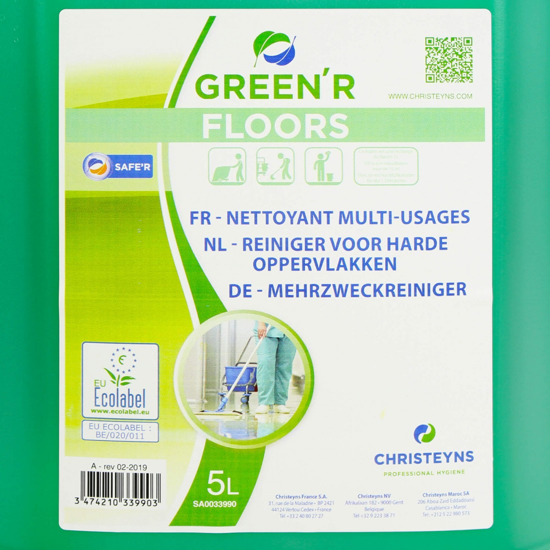 Plus d'info...GREEN’R FLOORS est un nettoyant multi usages très performant. Dilué, en utilisation manuelle ou en machine industrielle (auto-laveuse), ce nettoyant ecolabelisé de pH neutre, en dilution, non moussant et agréé contact alimentaire vous assure un nettoyage efficace de tous les sols et de toutes les surfaces lavables y compris les sols protégés et surfaces fragiles. Adapté pour des entretiens réguliers, il redonne brillance et éclat. Il agit rapidement et laisse une odeur florale douce et fraiche très agréable sans laisser de traces. GREEN’R FLOORS a un impact sur l’environnement très réduit