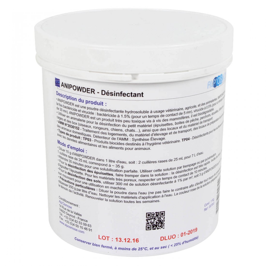 Plus d'info...• ANIPOWDER+ est une poudre désinfectante hydrosoluble à usage vétérinaire, agricole, et des animaleries. Elle est à la fois bactéricide, virucide et fongicide : bactéricide à 0.25% (30 mn, 10°C), virucide à 0.5% (30 mn, 10°C) et fongicide à 1.5% (30 mn, 10°C)