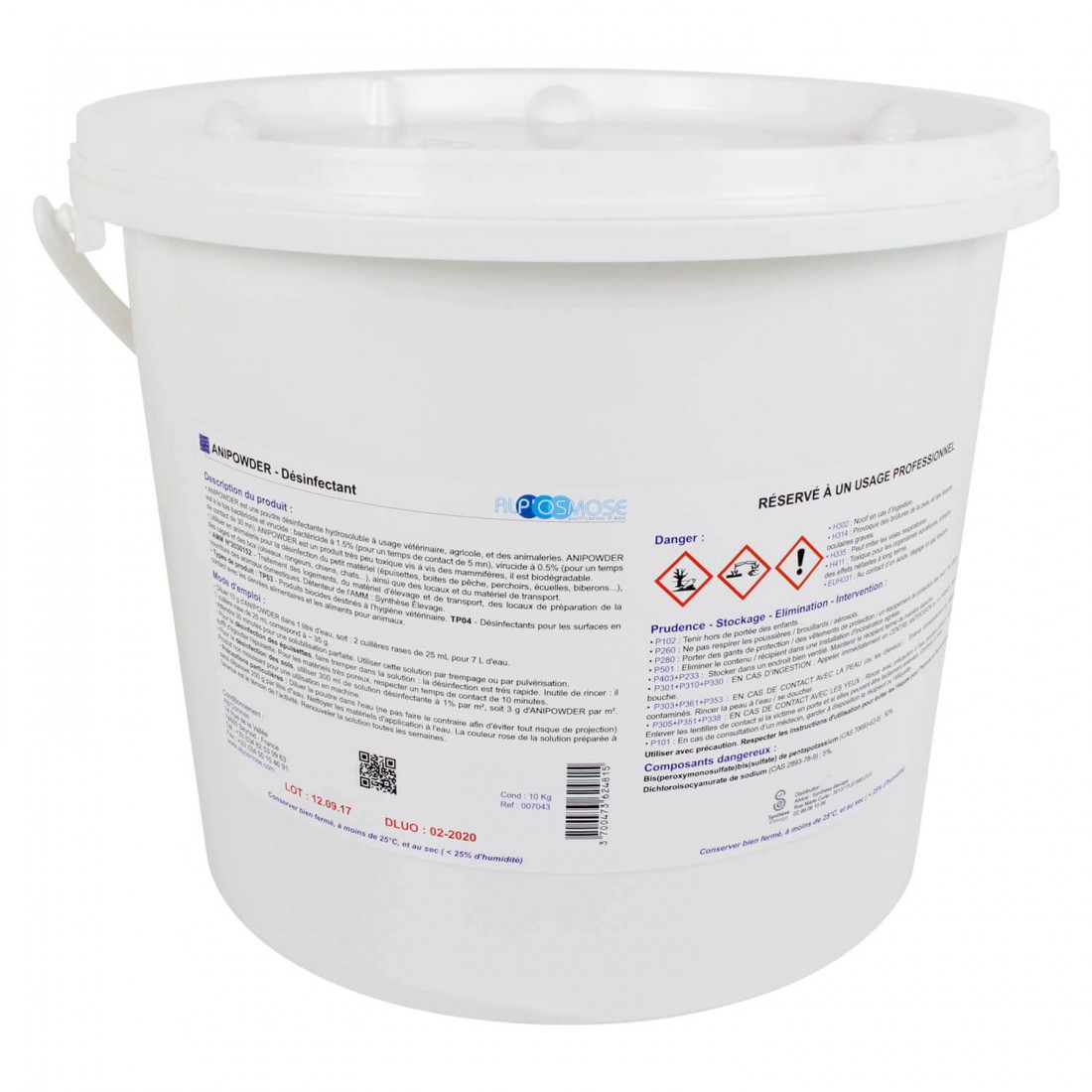 Plus d'info...• ANIPOWDER+ est une poudre désinfectante hydrosoluble à usage vétérinaire, agricole, et des animaleries. Elle est à la fois bactéricide, virucide et fongicide : bactéricide à 0.25% (30 mn, 10°C), virucide à 0.5% (30 mn, 10°C) et fongicide à 1.5% (30 mn, 10°C)